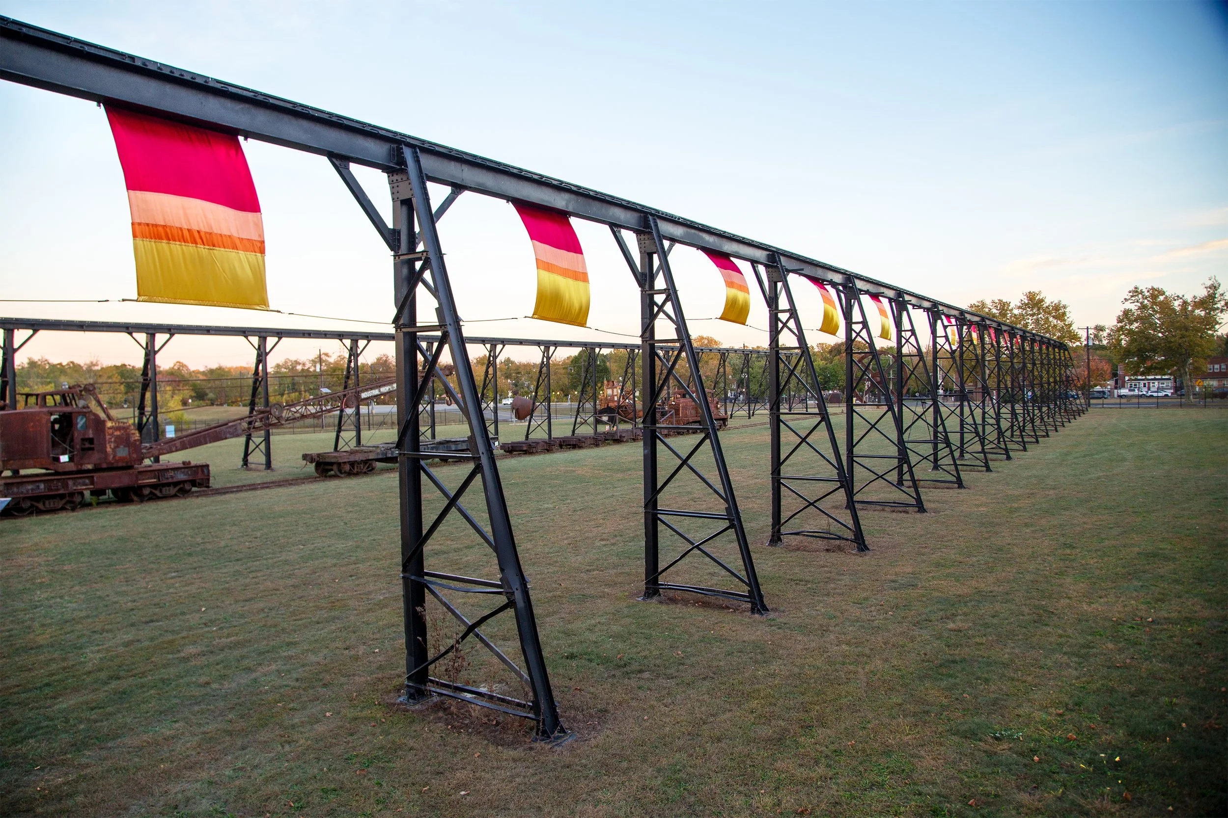 On the 50th anniversary of the mill’s closure, this installation created an abstract sunset design that stretched across the steel mill’s former scrapyard. Sunset refers to the closure of the Roebling Mill, the color gradient of steel when it is melted, and the dwindling of the fossil fuels used by the mill for power. The length of each banner corresponded with the concentration of carbon in the atmosphere every three years from the time the mill opened in 1905 to its closure in 1974.